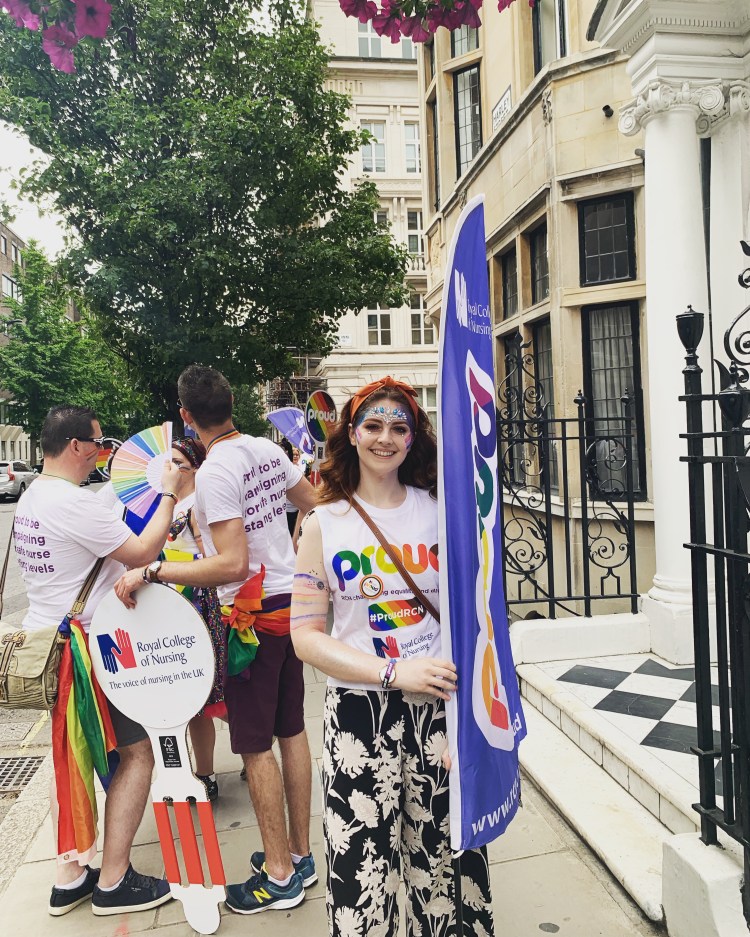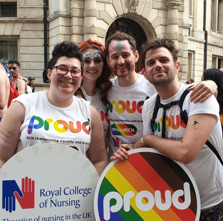 In the weeks running up to Pride 2019 I heavily debated whether this is the year I would march and fly my flag. I had never been before. As Saturday 6th July came ever closer, I had nearly resigned to waiting another year. I really wanted to go, but I felt apprehensive that I wouldn’t fit in. I felt very silly for feeling this way as I have no embarrassment for who I am, but it was a worry that stemmed from comments I’d received during the times when I was trying to understand my sexuality, comments like “you’re obviously not gay” and other efforts to make me feel like my appearance and behaviour didn’t fit in to what ignorant people expected of an LGBTQ+ individual, so much so, that I almost believed them. Now, after meeting and marching with such a welcoming, proud, beautiful bunch of RCN members and staff (all 27 of them!), I know I had nothing to worry about.
